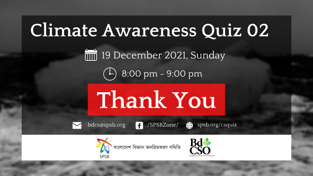 “Climate Awareness Quiz 02” শীর্ষক জলবায়ু সচেতনতা বিষয়ক অনলাইন কুইজ প্রতিযোগিতায় অংশগ্রহণকারী সবাইকে ধন্যবাদ।