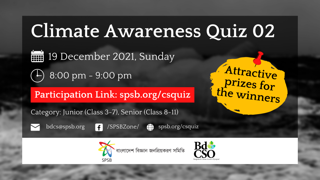 জলবায়ু পরিবর্তনের প্রভাবজনিত কারণে সবচেয়ে ঝুঁকিতে থাকা দেশগুলোর মধ্যে বাংলাদেশ অন্যতম । এর প্রভাবে আমাদের দেশে বসবাসকারী শিশু ও তরুণ জনগোষ্ঠীর স্বাস্থ্য, শিক্ষা ও সুরক্ষাকে হুমকির মুখে ফেলছে।দক্ষিণ এশিয়ায় ইউনিসেফের তথ্যমতে, জলবায়ুর পরিবর্তন দক্ষিণ এশিয়ার লাখ লাখ শিশুর জীবনযাত্রাকে প্রভাবিত করেছে। এই অঞ্চলে খরা, বন্যা, বায়ু দূষণ ও নদী ভাঙনের কারণে লাখ লাখ শিশু গৃহহীন ও ক্ষুধার্ত এবং কোনো কোনো ক্ষেত্রে স্বাস্থ্যসেবা ও পানিবিহীন অবস্থায় রয়েছে। জলবায়ু পরিবর্তন ও কোভিড-১৯ মহামারি একত্রে দক্ষিণ এশিয়ার শিশুদের জন্য একটি উদ্বেগজনক সংকট তৈরি করেছে। এখনই পদক্ষেপ গ্রহণের সময় – আমরা যদি পানি, স্বাস্থ্যসেবা ও শিক্ষার পেছনে বিনিয়োগ করি, তাহলে পরিবর্তনশীল জলবায়ু এবং অবনতিশীল পরিবেশের প্রভাব থেকে তাদের ভবিষ্যতকে আমরা রক্ষা করতে পারি।পৃথিবীর বাসিন্দা হিসেবে সবার সম্মিলিত প্রচেষ্টা ও সচেতনতার দ্বারা জলবায়ু পরিবর্তনের এই বিরুপ প্রবভাকে কমিয়ে এই গ্রহকে বাঁচানো সম্ভব। আর এই লক্ষেই “বাংলাদেশ বিজ্ঞান জনপ্রিয় করন সমিতি” ও “বাংলাদেশ ক্লাইমেট সায়েন্স অলিম্পিয়াড” আগামী ১৯ ডিসেম্বর, ২০২১ রাত ৮ টাই ক্লাইমেট সাইন্সের ওপর একটি ওপেন কুইজ আয়োজন করতে যাচ্ছে। কুইজের বিস্তারিত: শিরোনাম: Climate Awarness Quiz 02 | SPSB তারিখ: ১৯ ডিসেম্বর ২০২১সময়: রাত ৮:০০ টা ক্যাটেগরি: জুনিয়র (৩য়-৭ম শ্রেণি), সিনিয়র (৮ম-১১ শ্রেণি) পুরস্কার: বিজয়ীদের জন্য থাকবে আকর্ষণীর পুরস্কার। অংশগ্রহণের প্রক্রিয়া:কুইজে অংশগ্রহণের জন্য নিচের গুগল ফর্ম পূরণ করে রেজিস্ট্রেশন সম্পন্ন করতে হবে। যেকোনো প্রয়োজনে bdcs@spsb.org এই ইমেইলে যোগাযোগ করা যাবে। #SPSB #CSQuiz #BdCSO কুইজটিতে অংশগ্রহণ বিষয়ক নির্দেশনা: